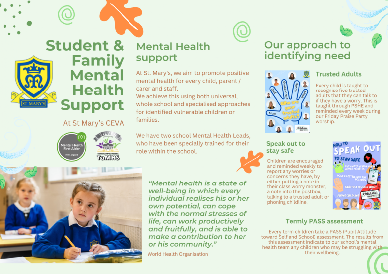 At St. Mary's, we aim to promote positive mental health for every child, parent / carer and staff. We achieve this using both universal, whole school and specialised approaches for identified vulnerable individuals or families.